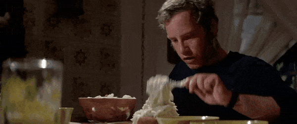 Neary, after a brief encounter with an alien spacecraft, has become so obsessed with the shape of Devils Tower that he starts to see it everywhere, even on his dinner plate.